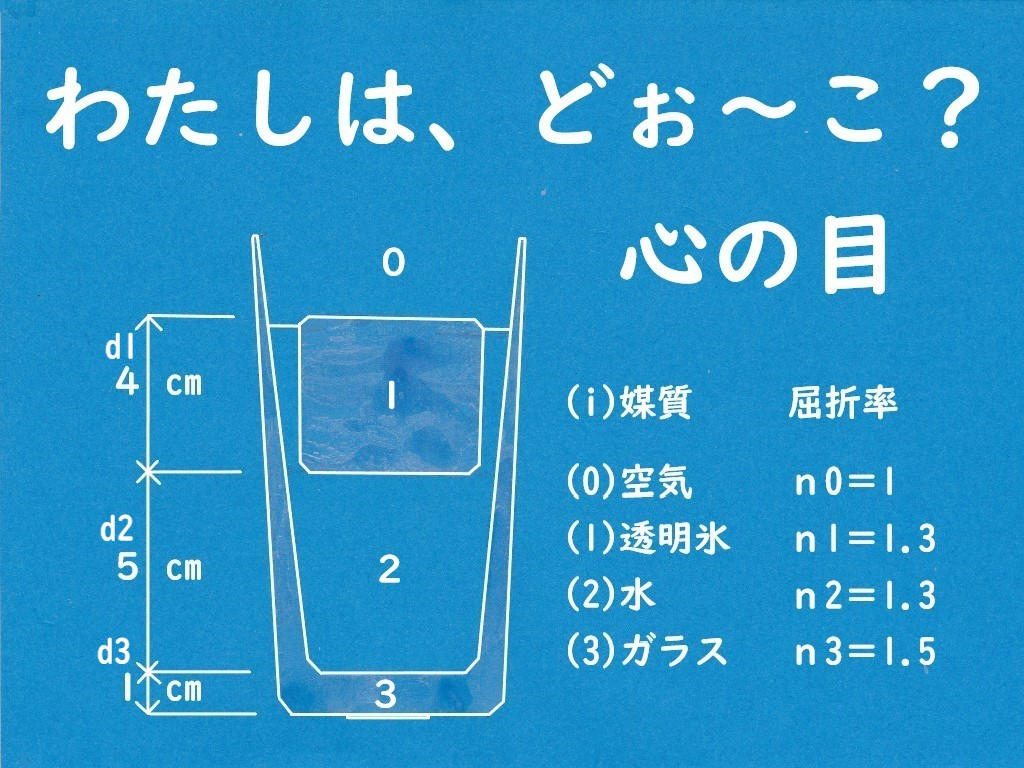 私はガラスコップの下底中央に貼り付いた5円玉です。(人が)コップの中央真上から見下ろす時、私はどの位置まで浮かび上がって見えるかな?